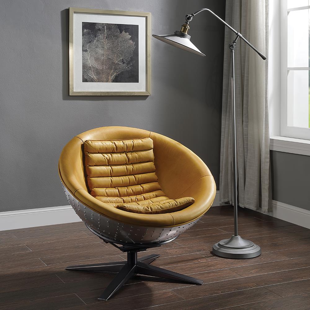 The Brancaster accent chair has a cool retro-futurist design that you won't find anywhere else. The warm hues of its turmeric top grain leather upholstery coats the round, dish-shaped interior, contrasting with the riveted aluminum exterior of the chair back like a space capsule. An 4-Star base provides stable support for this unconventional accent seat.