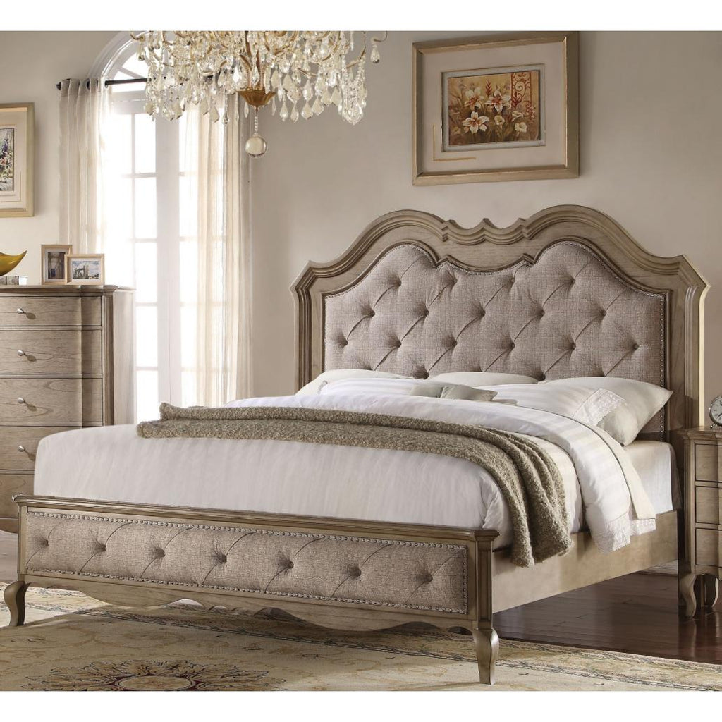 • Features: Padded Headboard/Footboard (Beige Fabric, Button Tufted, Nailhead Trim), Raised Molding Trim, Wooden Cabriole Leg