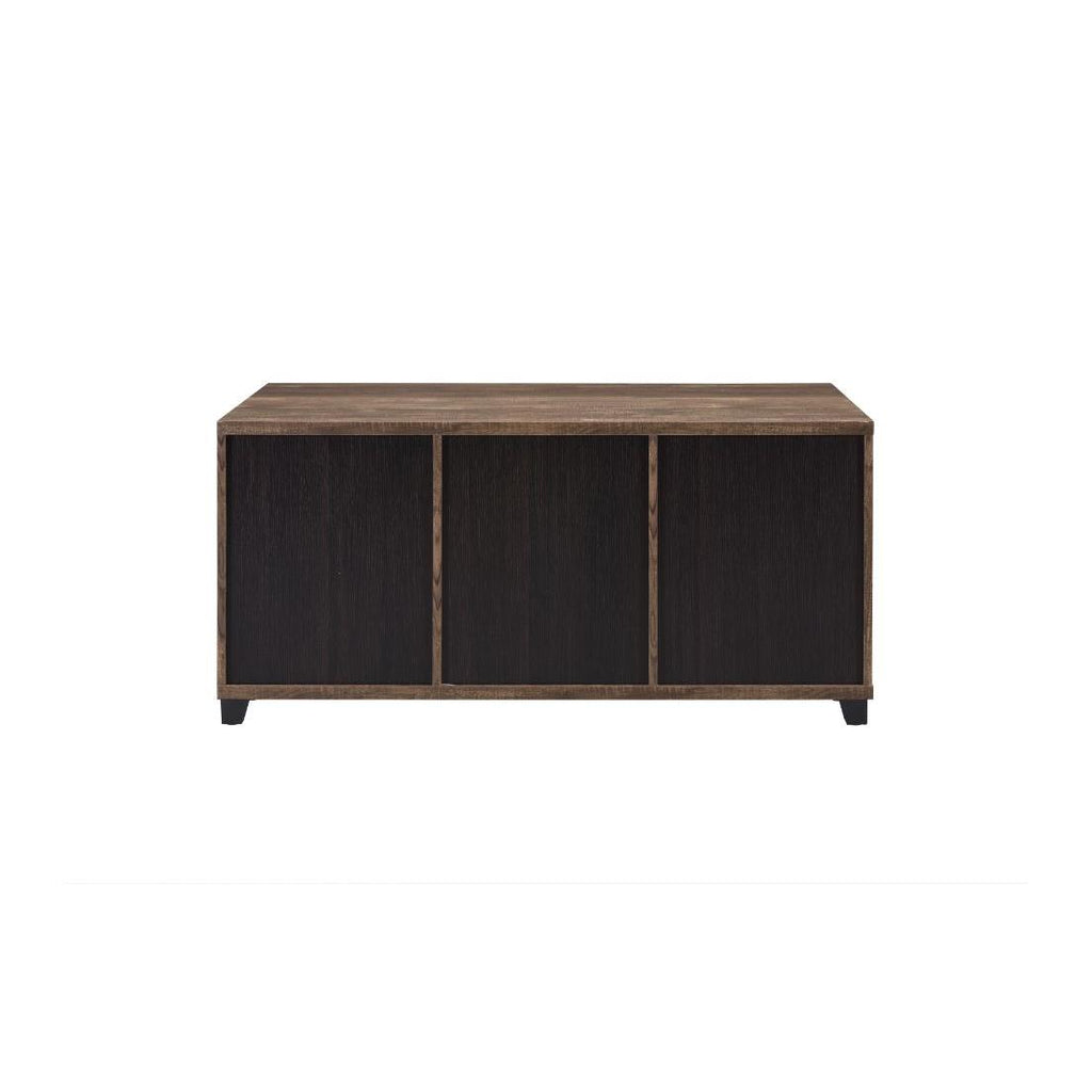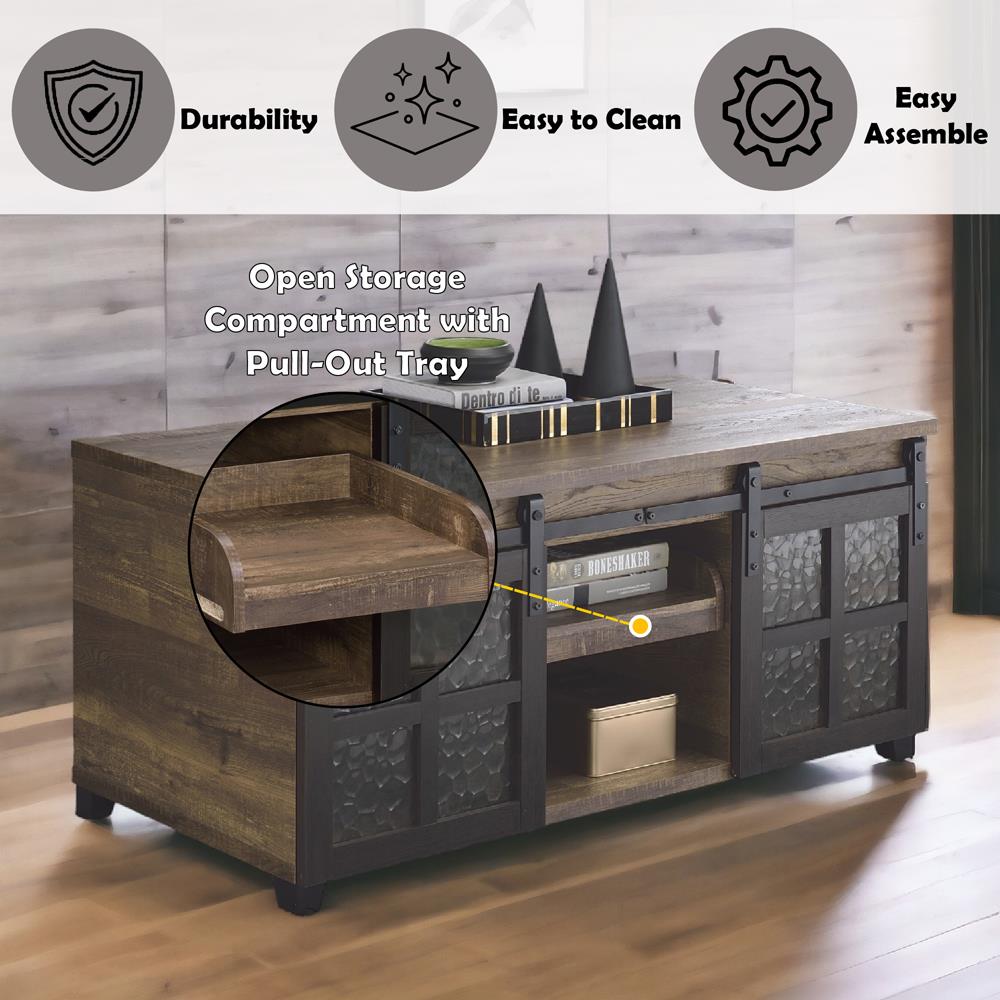 The rustic wooden frame and industrial metal Accent complement each other perfectly. The coffee table embodies a raw, utilitarian aesthetic... The rustic wooden frame and industrial metal Accent complement each other perfectly. The coffee table embodies a raw, utilitarian aesthetic that adds a strong design presence to the space. Two sliding barn doors with obscure glass insert offer both privacy and style. A storage compartment behind each barn door frees up tabletop space. Between two doors is an open storage compartment with a pull-out tray for remotes, nail clipper, or other odds and ends that you want easy access to. View more