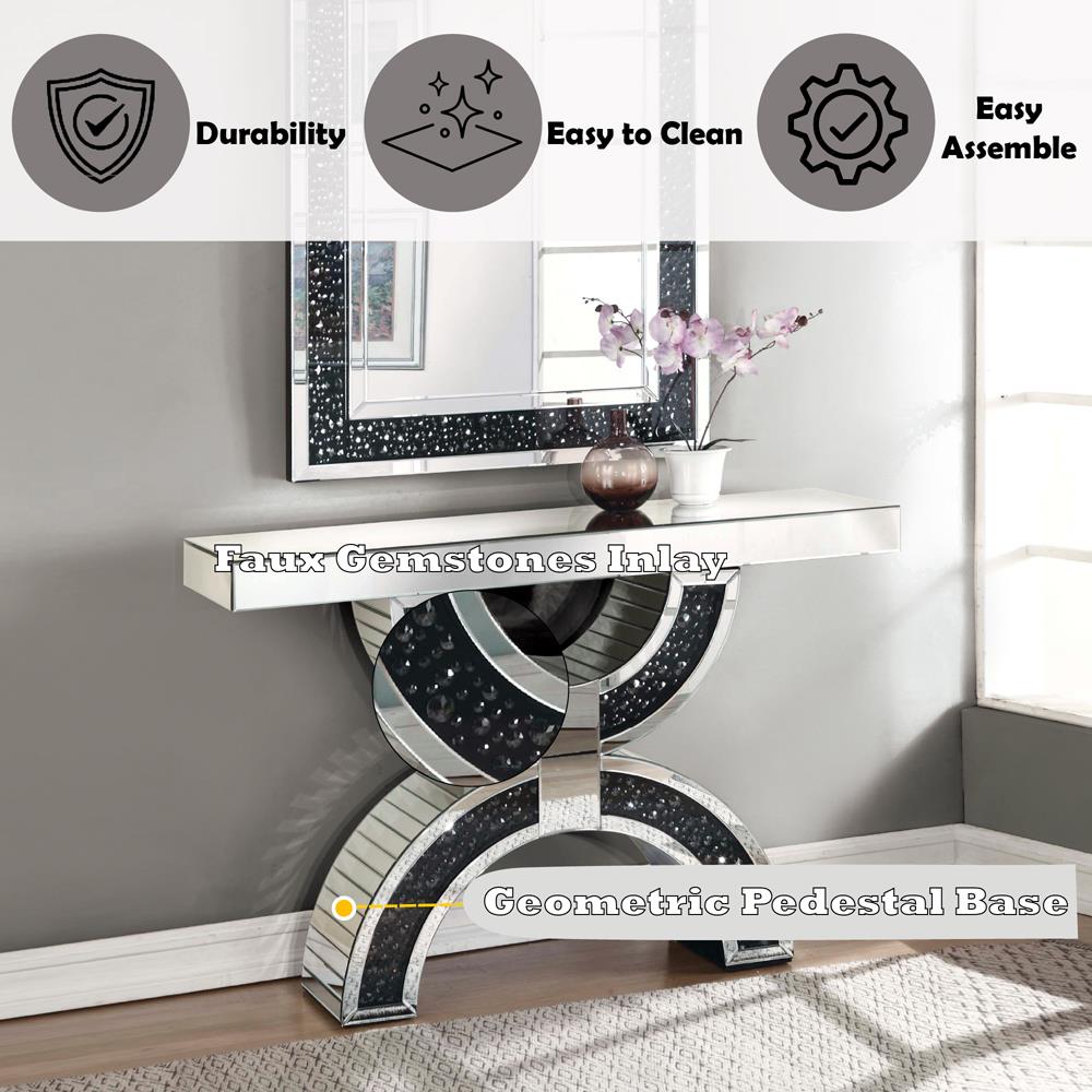 • Mirrored Base: Geometric Shape Pedestal with Clear Glass & Faux GemStones Inlay over Black Panel, 5mm Beveled Mirror, MDF