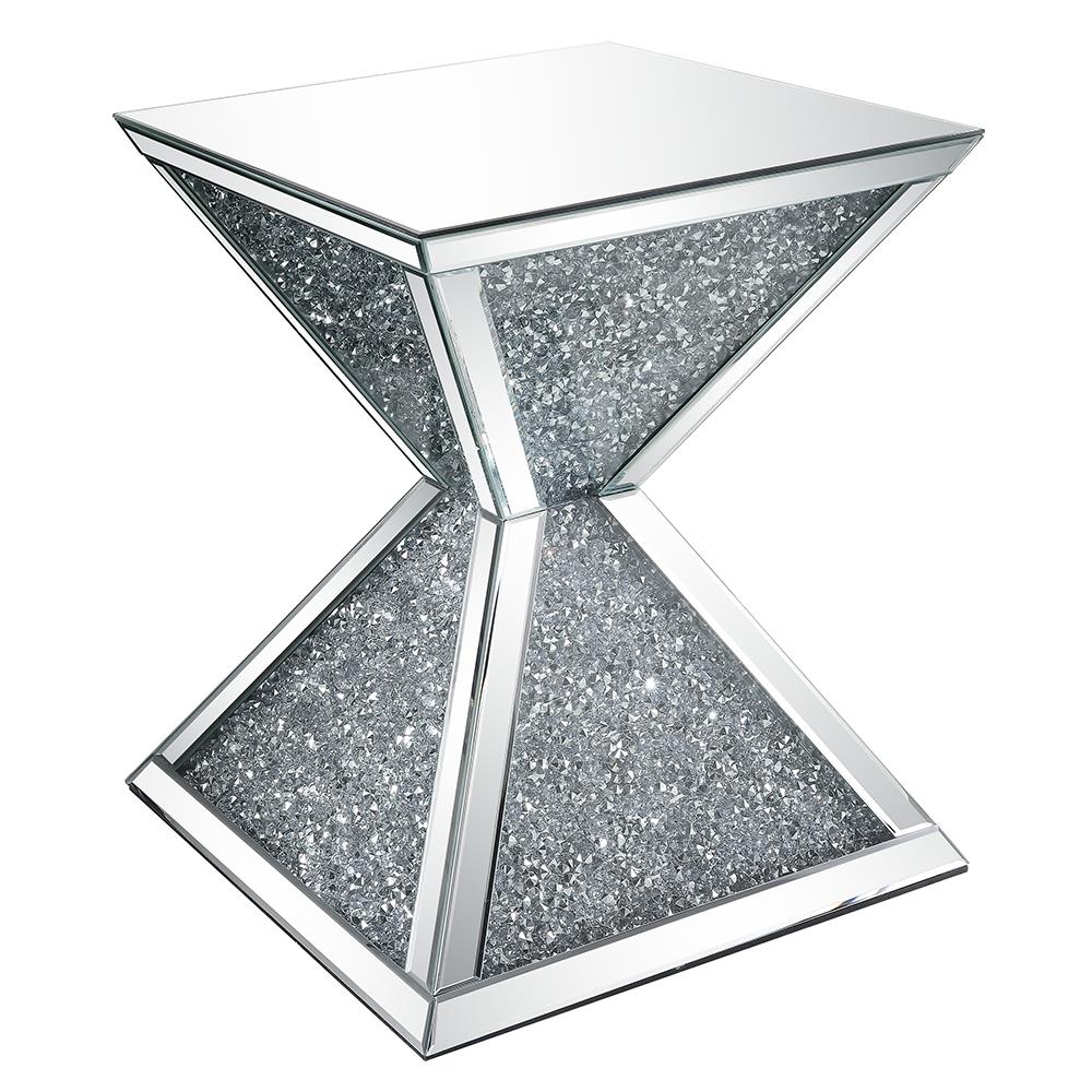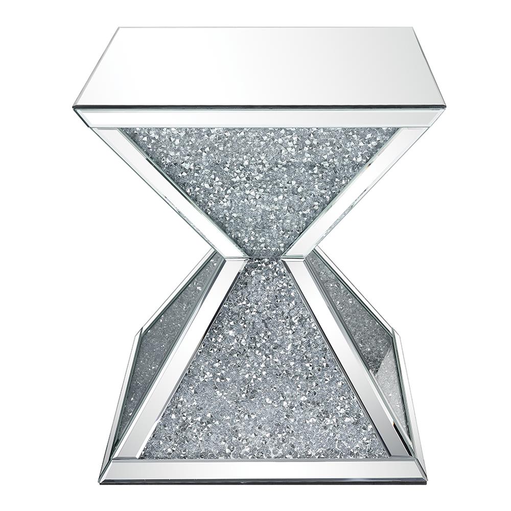 • Features: Mirrored Top, Geometric Base w/Faux Diamonds Inlay & Clear Glass