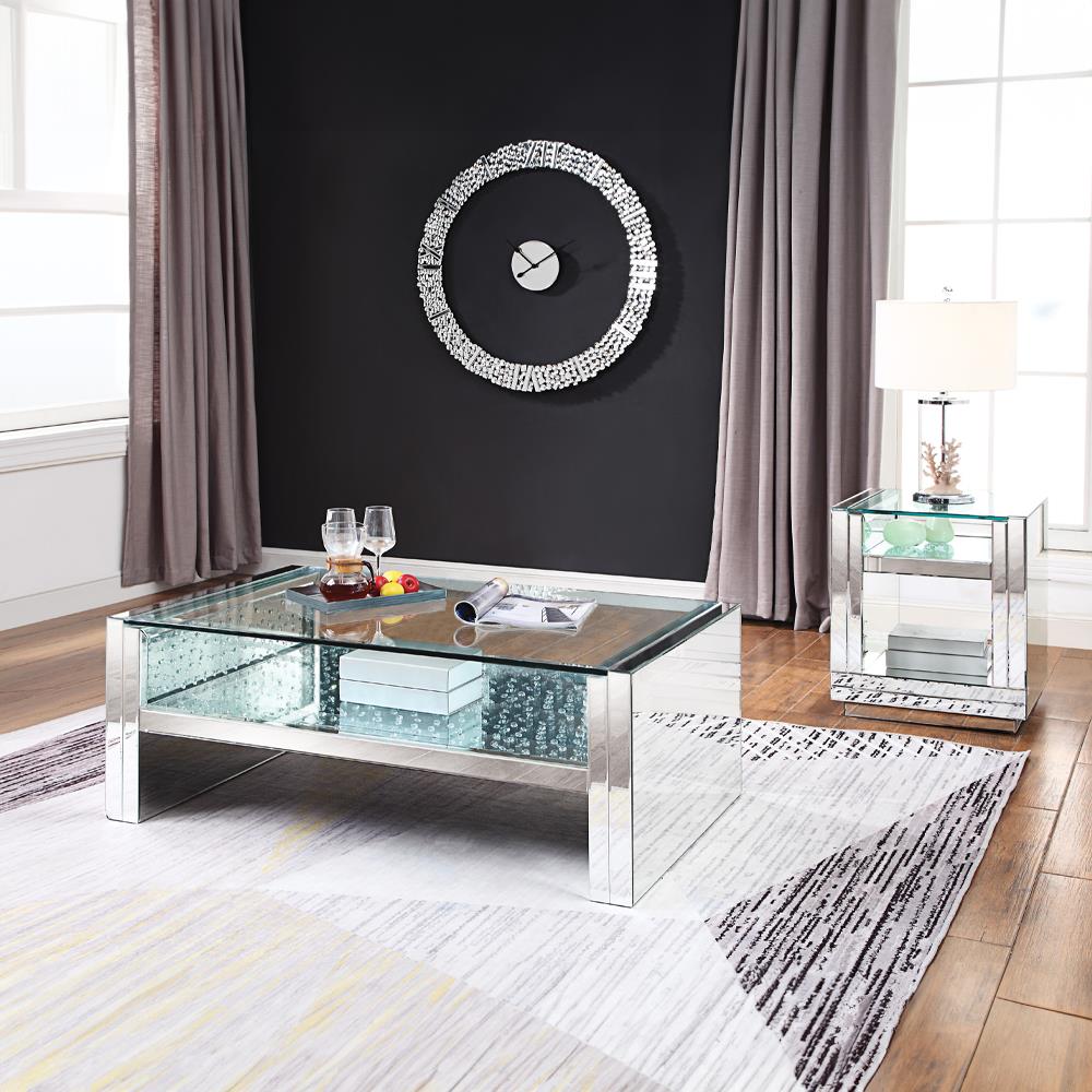 • Mirrored Sled Frame, Glass Top: 4mm Clear Tempered with Faux Crystals Inlay (Open Base)