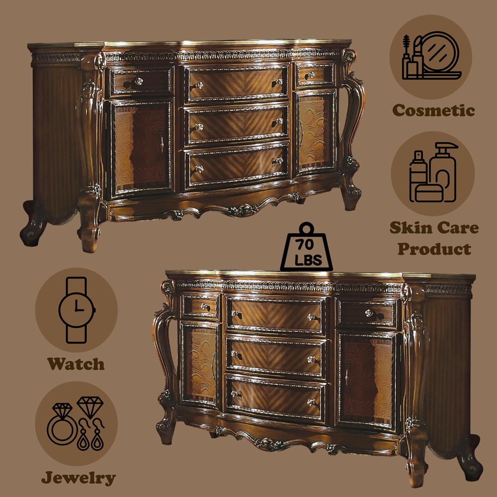 • Casegood: Bow-Front, Same Finish Top, Oversized Scrolled Leg and Base (Front Drawers with Raised Scrolled Trim): Poly Resin with Antique Contrast Finish