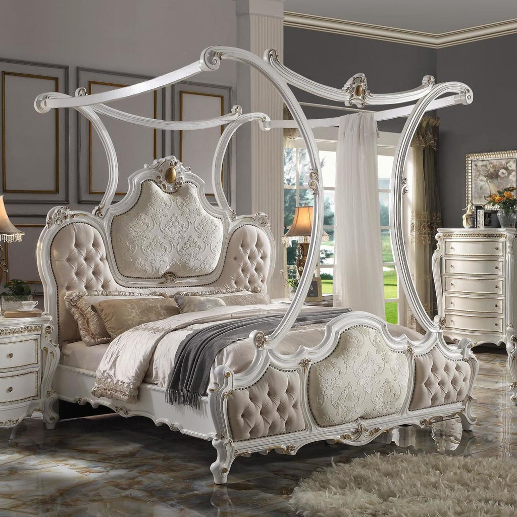 • Padded Headboard/Footboard: Fabric, (Button Tufted w/Nailhead Trim), Oversized Crown, Trim & Scrolled Style Leg with Vintage Hand-Brushed Finis