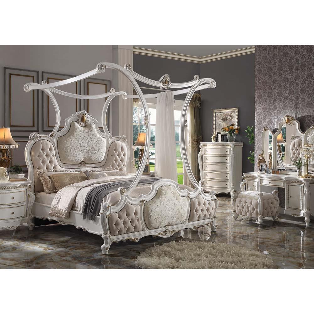 • Padded Headboard/Footboard: Fabric, (Button Tufted w/Nailhead Trim), Oversized Crown, Trim & Scrolled Style Leg with Vintage Hand-Brushed Finis