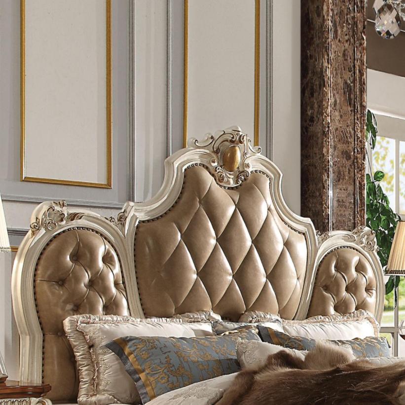 • Features: Padded Headboard/Footboard, Raised Scrolled-Oversized Molding Trim, Button Tufted Panels (Side), Nailhead Trim, Antique Contrast Finish