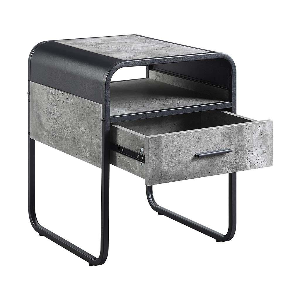 For a low-profile yet stylish addition to your living room, look no further than this modern Raziela end table. This... For a low-profile yet stylish addition to your living room, look no further than this modern Raziela end table. This modern end table accomplishes a chic modern design with its smooth top and sleek faux concrete and black frame. This end table has luxurious faux concrete shelving for an on-trend look without the weight. The minimalist metal frame promotes a strong construction, promising to hold up to many years of family get-togethers. Its wide top offers plenty of space for impromptu snack buffets or a few pieces of decor. The open shelf also provides additional space to store books, and much more. While the drawer allows for concealed storage. View more