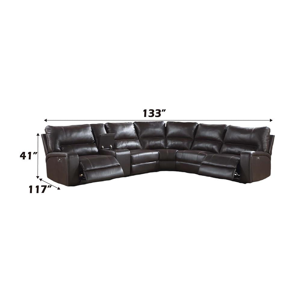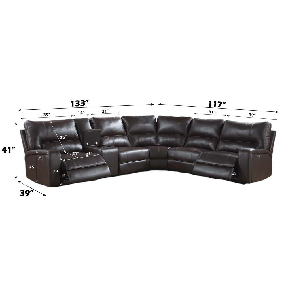 KD, Sectional (Power Motion & 2 USB Charging Docks) "L" Shape (Reversible Console & Armless Chairs) Includes: 2 Reclining Seats (Power Motion LAF/RAF), 3 Stationary Seats (2 Armless Chairs, Curved Wedge), Console w/Storage & Cup-Holder (Safety Hinge) FEATURES: Tight Back & Seat Cushion, Reclining Angle: 135 Degrees CONSTRUCTION Seat: Pocket Coil, Inside Frame: Wood, Ply, Foam Armrest: Wide Track (Block), Size: 23 Inches Height Metal Base with Power Motion: External Push-Button, each with 2 USB Charging Dock (Outside Armrest), OKIN Motor Material: (Solid Pattern, Same Tone Stitching) NO Pillows (No Sleeper, Cover Not Removable) Clearance between Wall & Sectional: 5 Inches (120mm), Reclined Chair Size: 65" Depth, Backrest: 29" Height, Footrest: 20" Height Console Storage Lid: 14" x 13" x 5"H