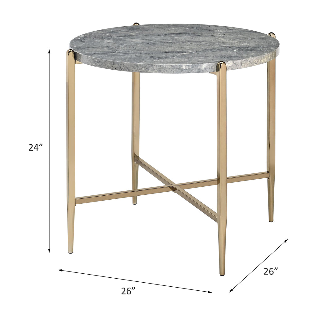 Sleek finish, sharp angles, and stylish designs were incorporated in this stunning modern piece. Shown in a champagne gold finish,... Sleek finish, sharp angles, and stylish designs were incorporated in this stunning modern piece. Shown in a champagne gold finish, the metal open base with X-shape support boasts a simple silhouette that exudes modern elegance. Round faux marble table top complements gold metal frame perfectly, creating a bold visual effect. Make your seating area more comfortable and complete with this voguish end table. View more