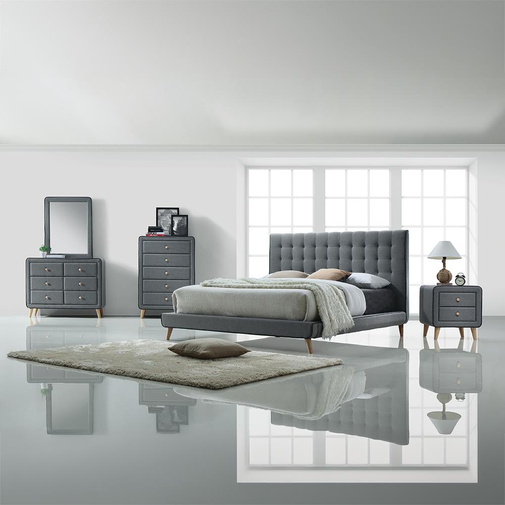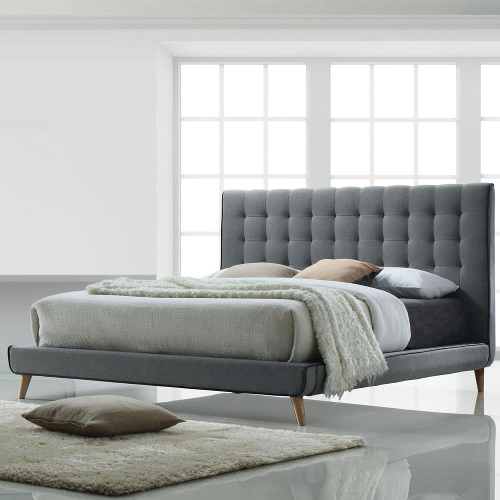 • Fully Padded Bed, Buttonless Tufted Headboard: Light Gray Fabric w/Black Piping
