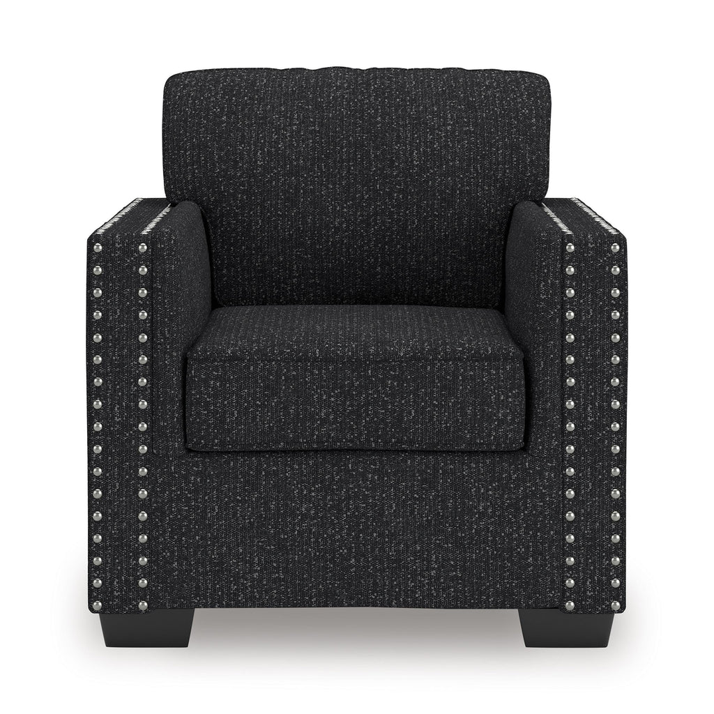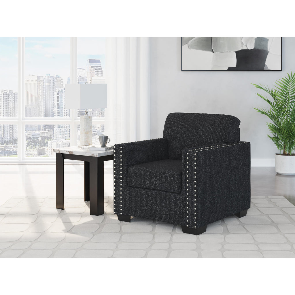 This stunning chair leaves a lasting impression. Its cozy cushions, chic coal-colored upholstery and striking nailhead trim are a perfect... This stunning chair leaves a lasting impression. Its cozy cushions, chic coal-colored upholstery and striking nailhead trim are a perfect blend of comfort and contemporary design. And here’s the showstopper—ambient red, white and blue LED lighting along the chair's base. The look is simply wow. View more