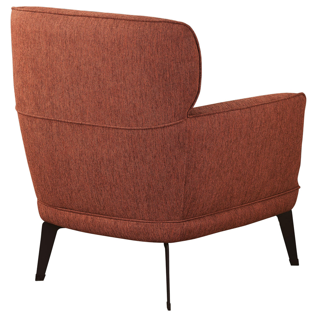 • Chic accent chair with modern and transitional style elements, upholstered in luxurious fabric, rounded track arms, deep non-removable seat cushion, and black metal legs