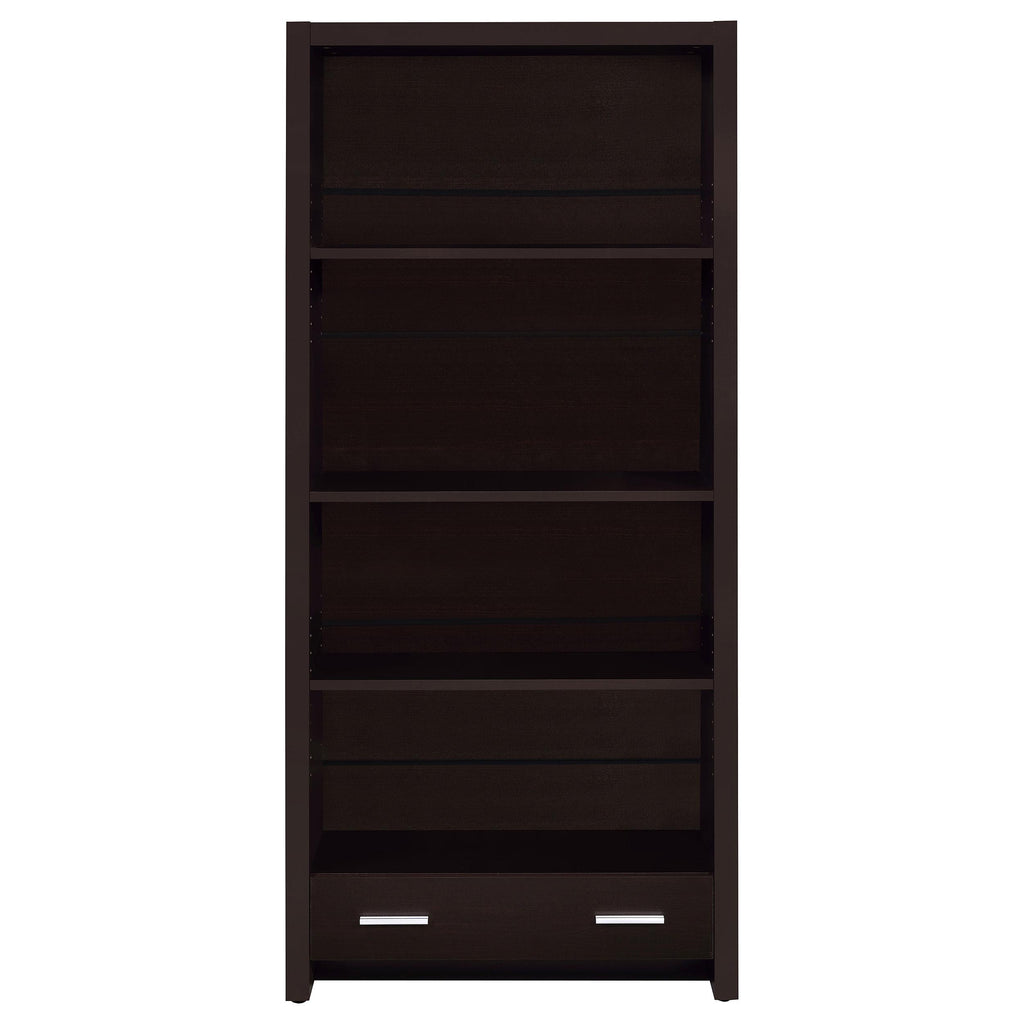 • Classy modern bookcase in cappuccino finish displays subtle strength