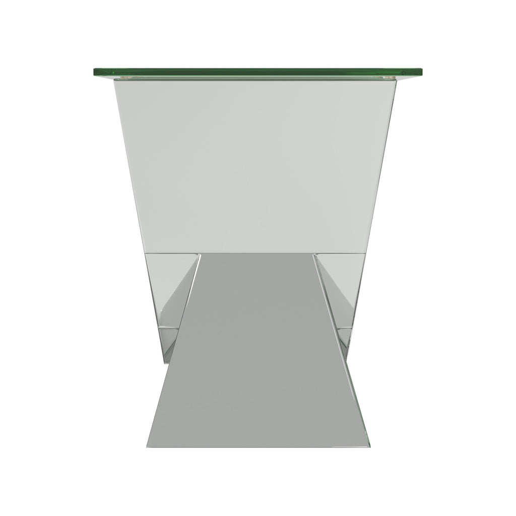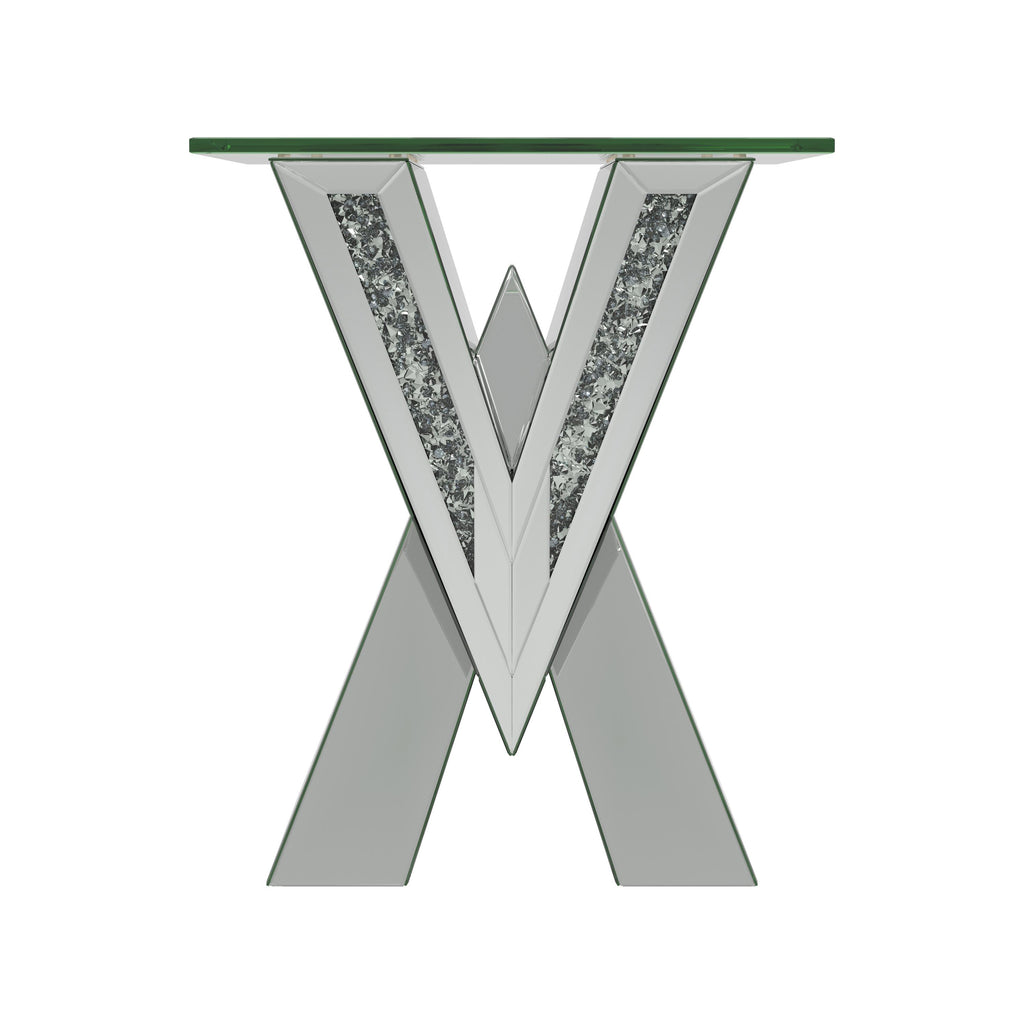 • Mirrored end table with a bold V-shaped base
