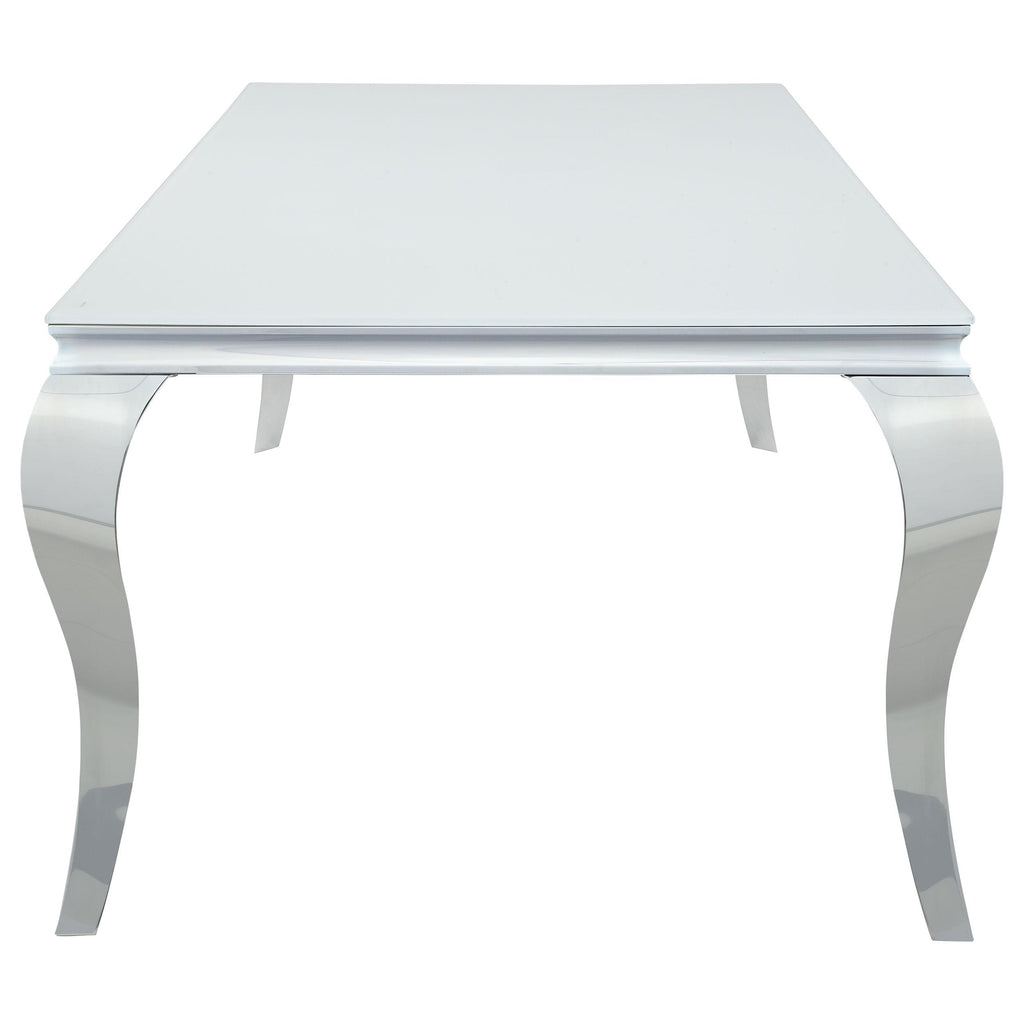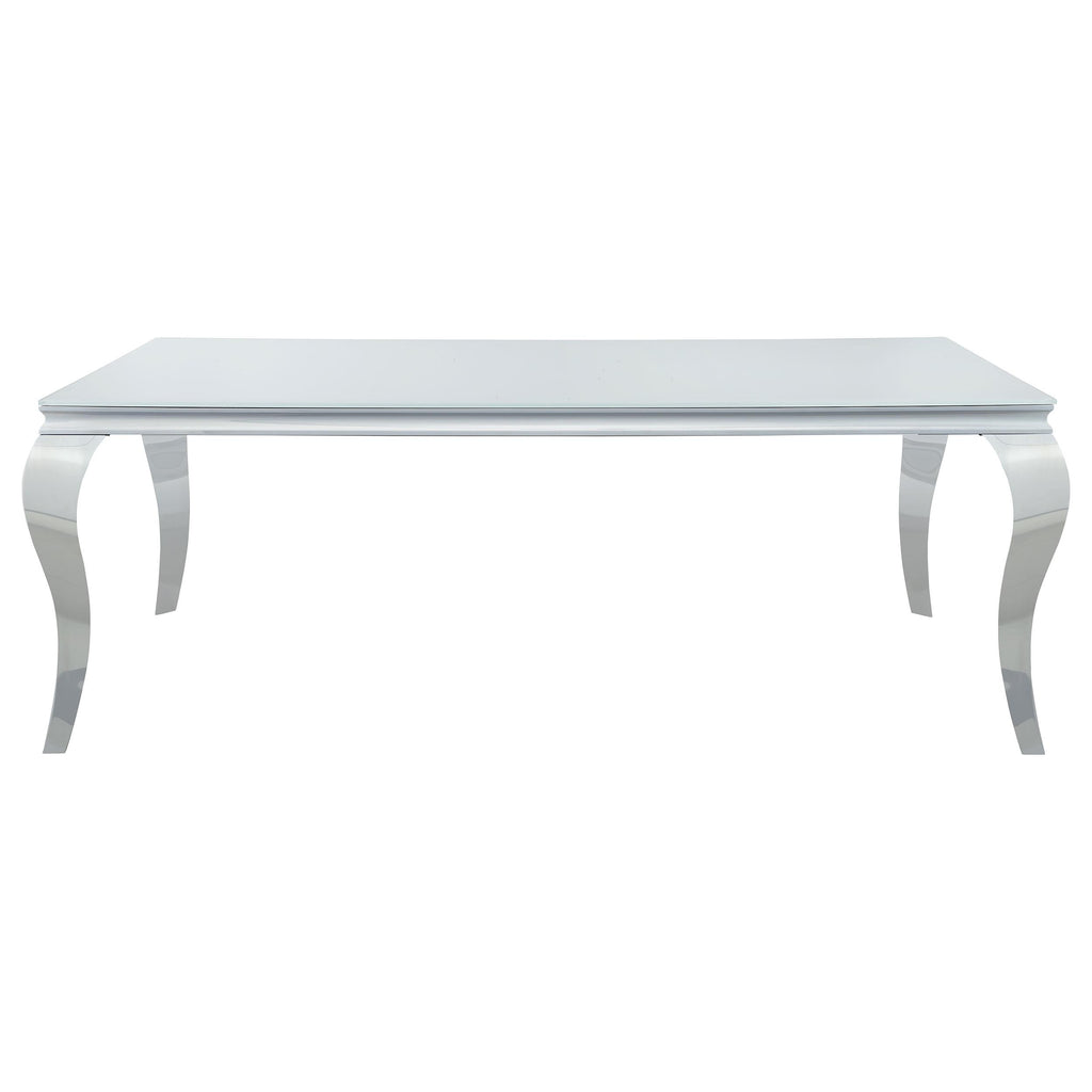 • Polished chrome finish table base features dramatically curved Cabriole legs topped with white tempered glass