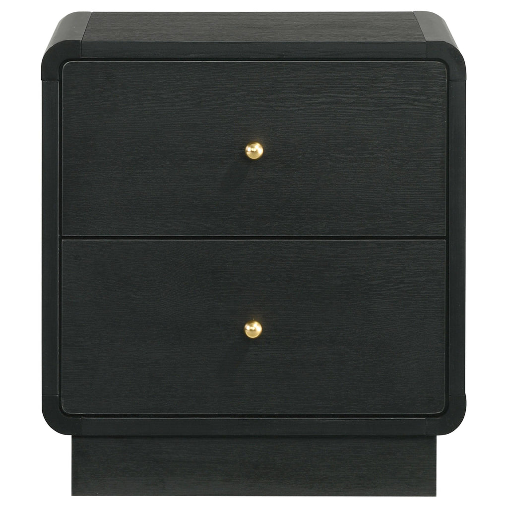 • A modern two-drawer nightstand creates a stylish accent while providing ample bedside storage