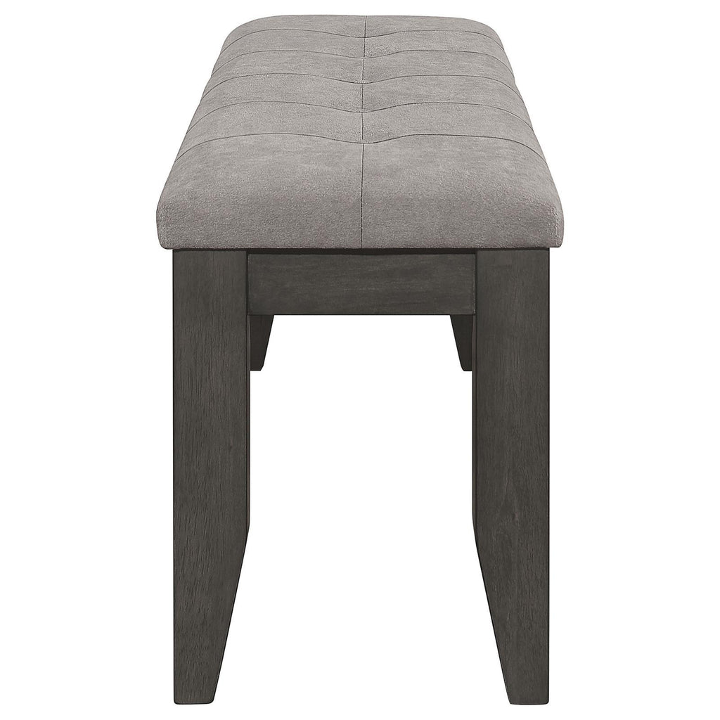 • A button-tufted cushioned bench seat upholstered in a soft grey fabric offer a comfy resting place