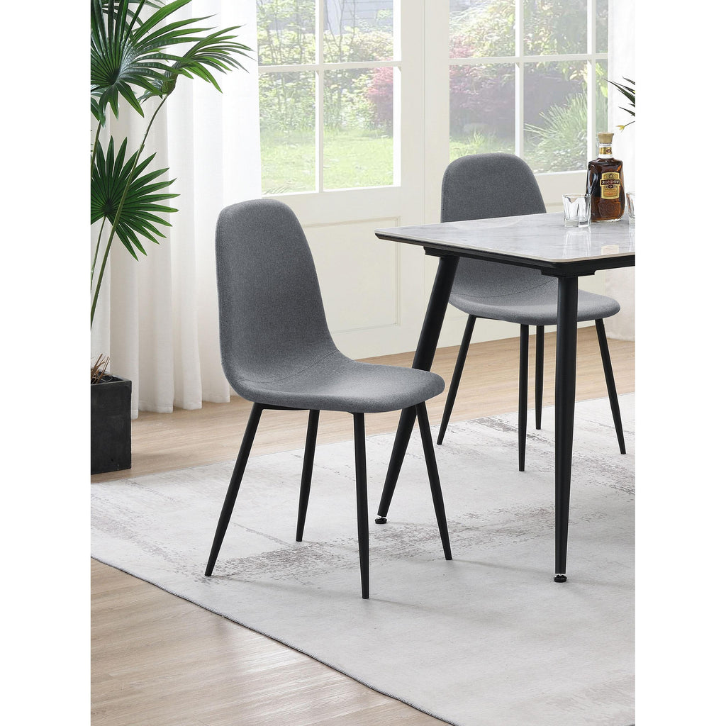 • A set of four contemporary side chairs instills modern minimalist flair with a refined look