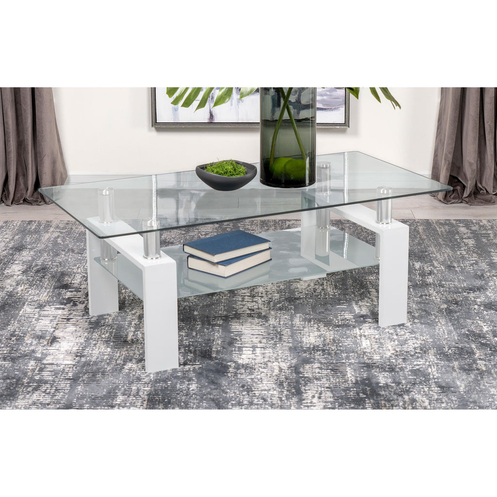 • Rectangular cocktail table with a sleek clear tempered glass top design