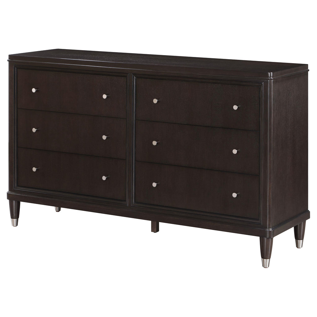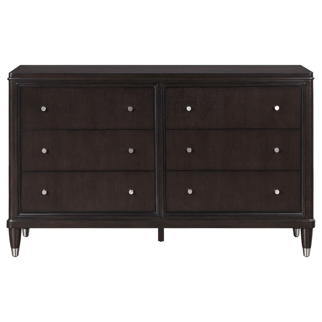 • A contemporary six-drawer dresser offers stylish clothing and accessory storage and a refined look