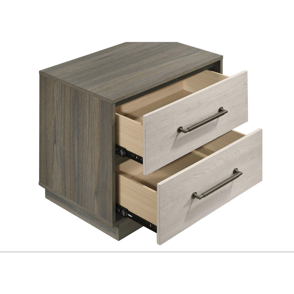 • Contemporary nightstand with a sleek two-tone melamine design