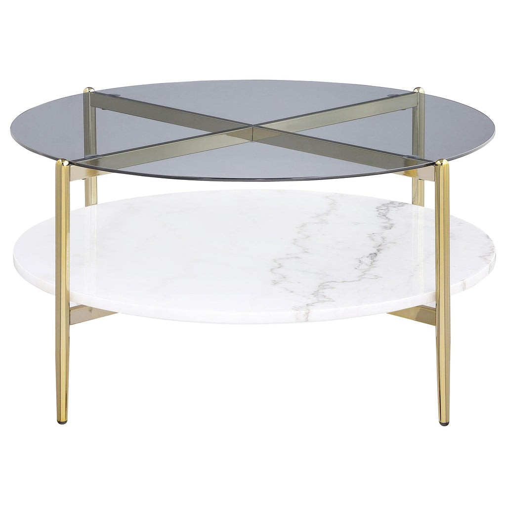 • Modern round coffee table with a smoked tempered glass top and luminous white marble shelf