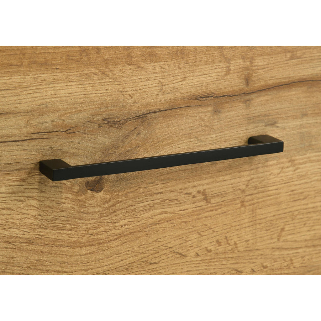 • Weathered brown and natural pine finish with matte black metal pull handles
