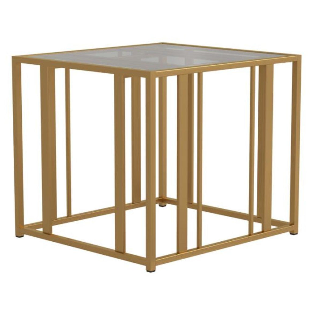 Add modern elegance to your living room with this gorgeous table set. Each table has a matte brass finished decorative... Add modern elegance to your living room with this gorgeous table set. Each table has a matte brass finished decorative base and a smoked glass table top. This set is composed of a coffee table, a sofa table, and an end table. View more