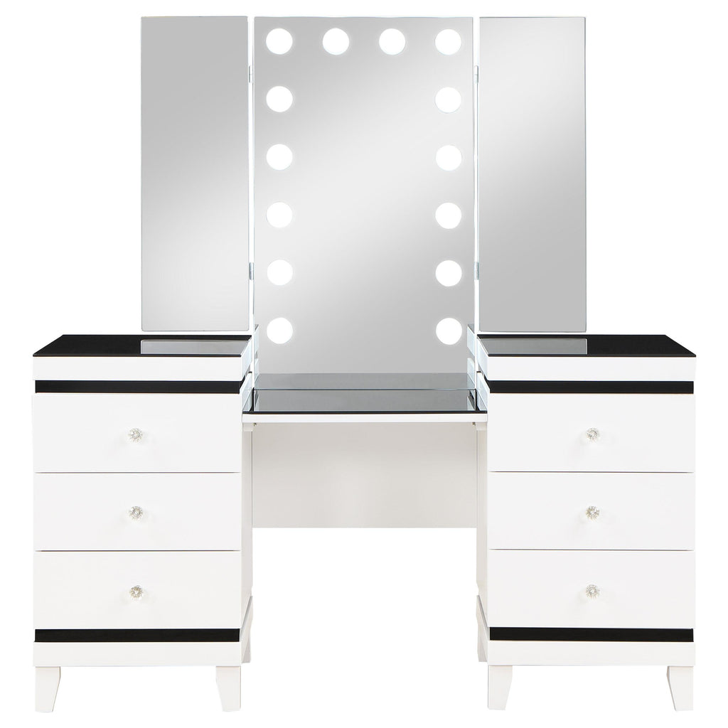 • Tri-panel mirror equipped with 14 lights for bright illumination when applying makeup and styling hair