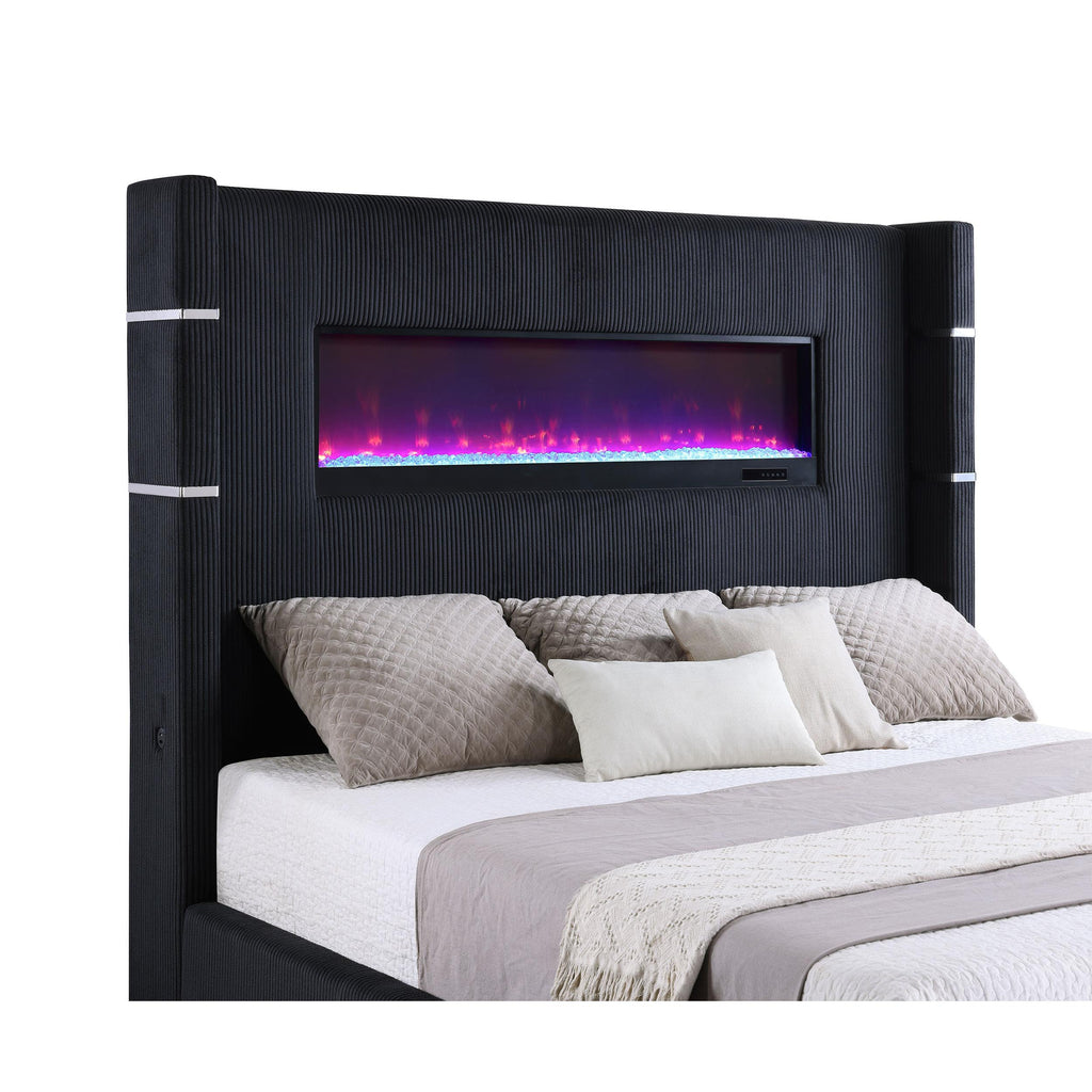 • California king size upholstered wingback panel bed with integrated flame box