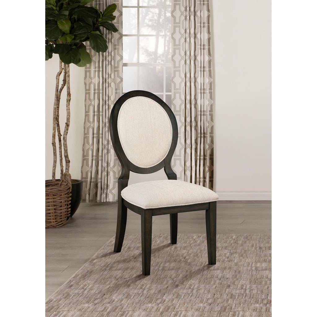 • Chairs have seat frame construction upholstered in a cream tone chenille fabric
