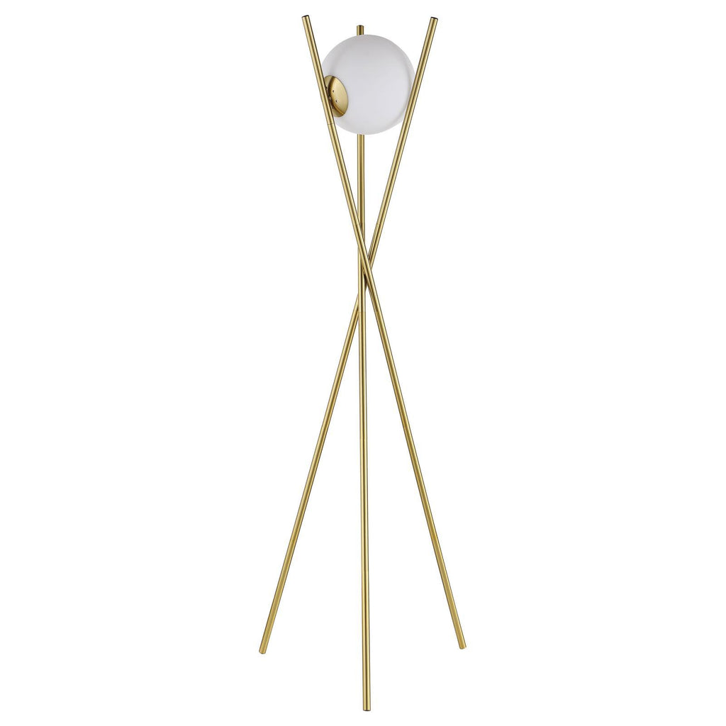 • Crossed rods form a tripod base with a round frosted white glass shade to filter ambient lighting