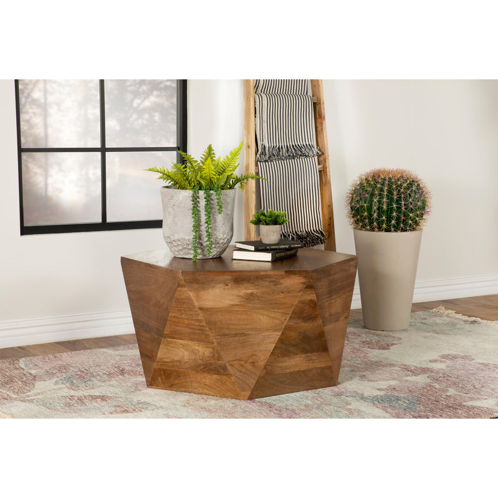 • Geometric coffee table crafted entirely from solid mango wood for lasting durability