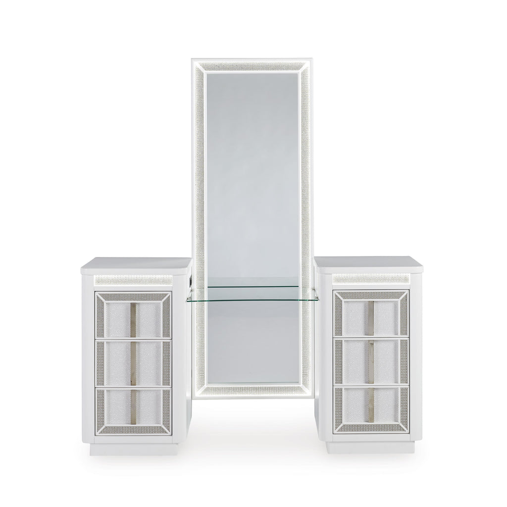 • Drawers with rhinestone frames; textured laminate drawer fronts