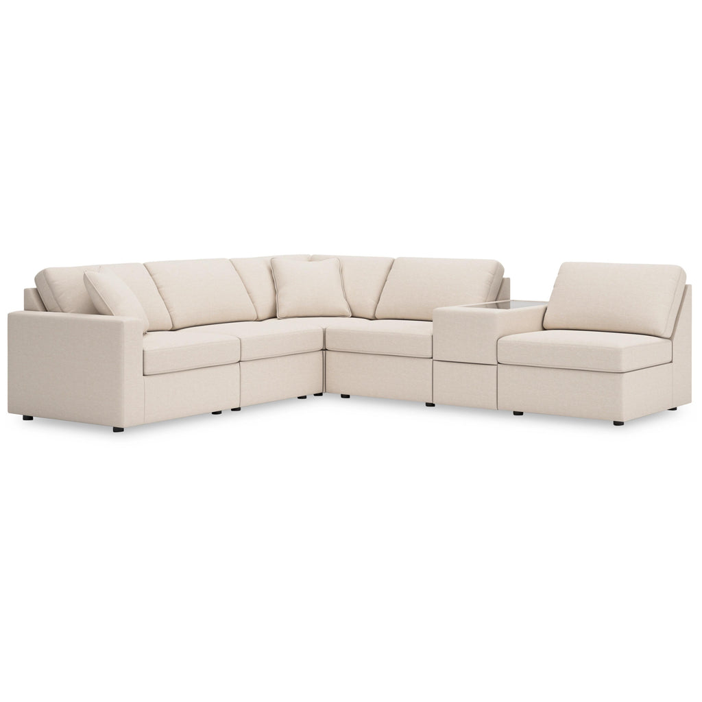 • Includes 6 modular pieces: left-arm facing corner chair, 3 armless chairs, console with storage and wedge