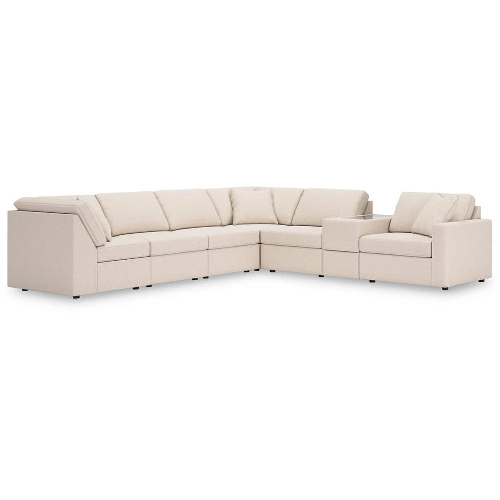 • Includes 7 modular pieces: right-arm facing corner chair, 3 armless chairs, console with storage and 2 wedges