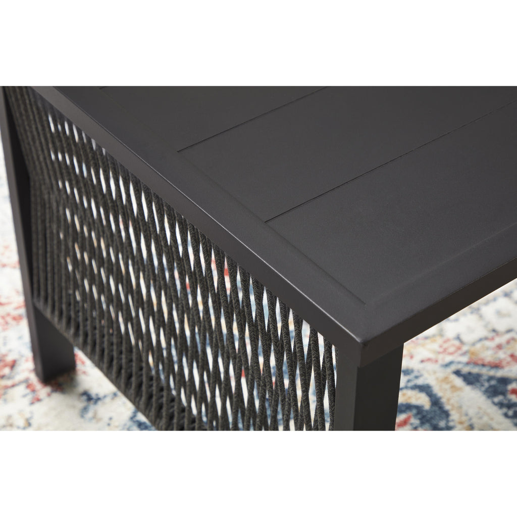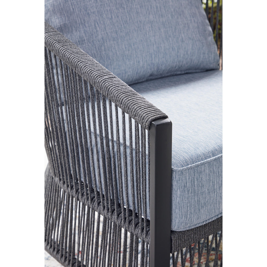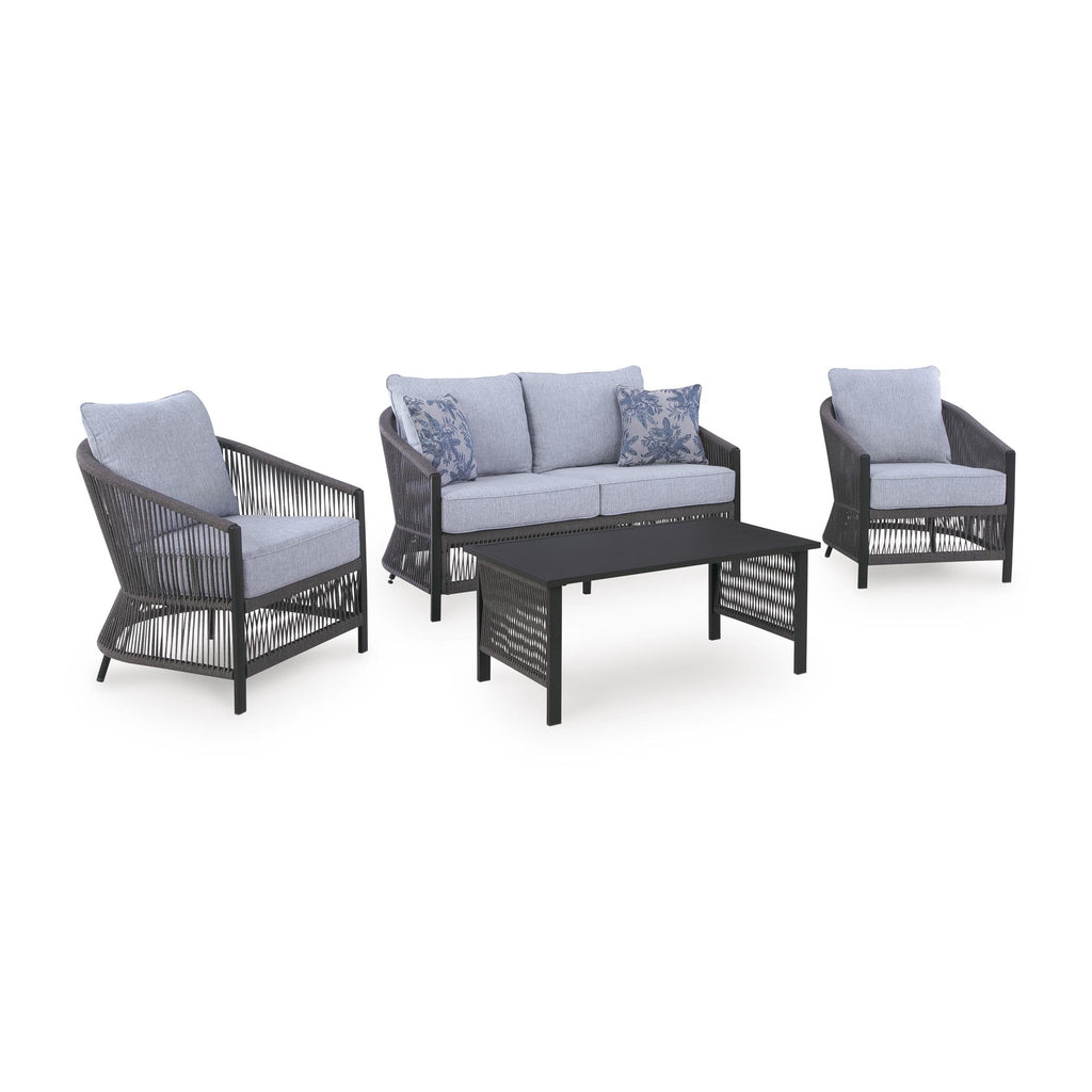Ready to bring indoor style to your outdoor space? This beautiful 4-piece table and chair set is the perfect choice... Ready to bring indoor style to your outdoor space? This beautiful 4-piece table and chair set is the perfect choice for creating a cozy patio retreat. A unique rope design lends the loveseat and lounge chairs a light and airy feel, while plush cushions wrapped in cleanable, UV-resistant fabric provide deep-seated comfort. And the table is just the spot to rest cocktails and coffee cups while you enjoy warm days and cool evenings with friends and family. View more