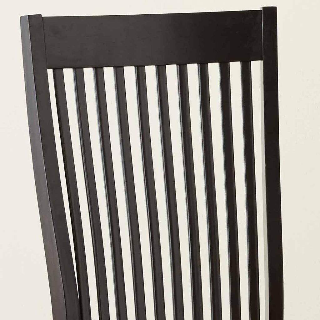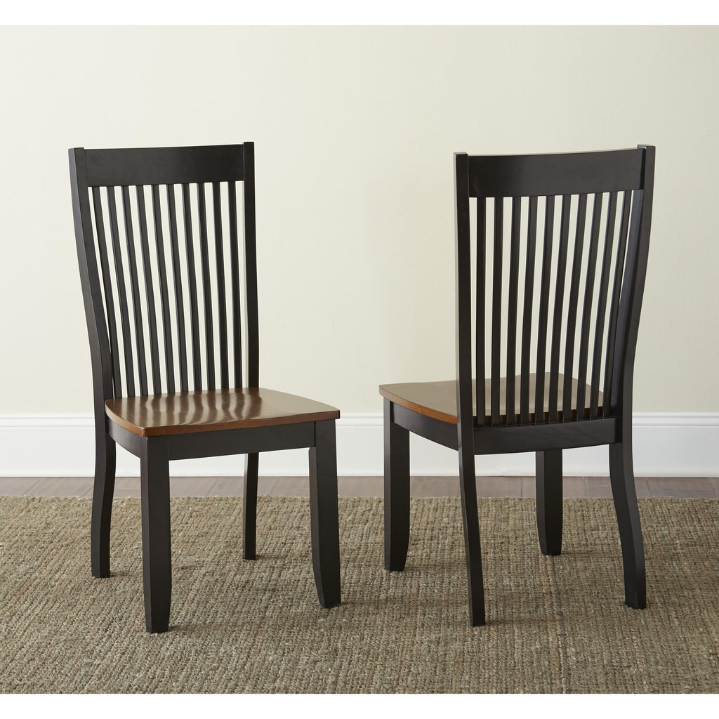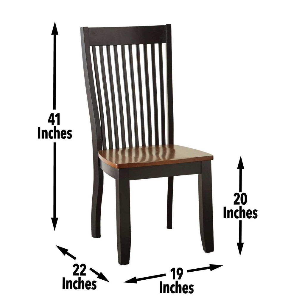• Crafted using solid wood Black finish with medium brown seat Curved back adds comfort Scooped seat Mission style slat back